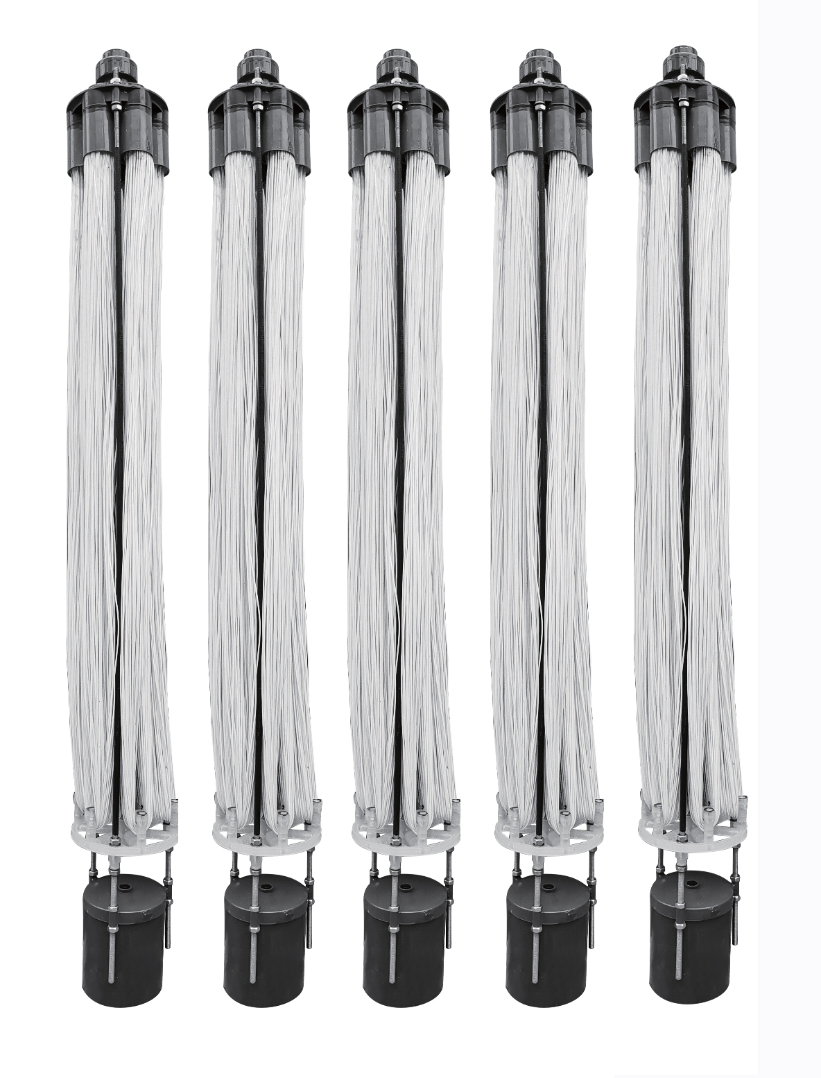 MBR系列浸入式中空纖維膜片(簾式膜)是專門為膜生物反應器(MBR)配套而研制開發的膜組件,采用中空纖維外壓式分離膜纖維制成,有如下特點: