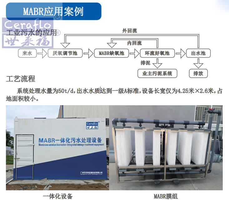 Ceraflo-MABR膜采用中空纖維膜結構,由自主專利技術及生產的微米級PTFE膜絲。讓膜絲內的空氣從微米級的孔隙向外滲透出去,讓水中的溶解氧得到更好的提升且能耗更低。對生物膜的分布以及碳源的利用有著更好的提升效果,大部分的好氧缺氧微生物會富集在膜絲內側。該生物膜反應單元組成的MABR,能夠高效處理污水,可減小反應池的大小,降低建造處理成本和減少用地。